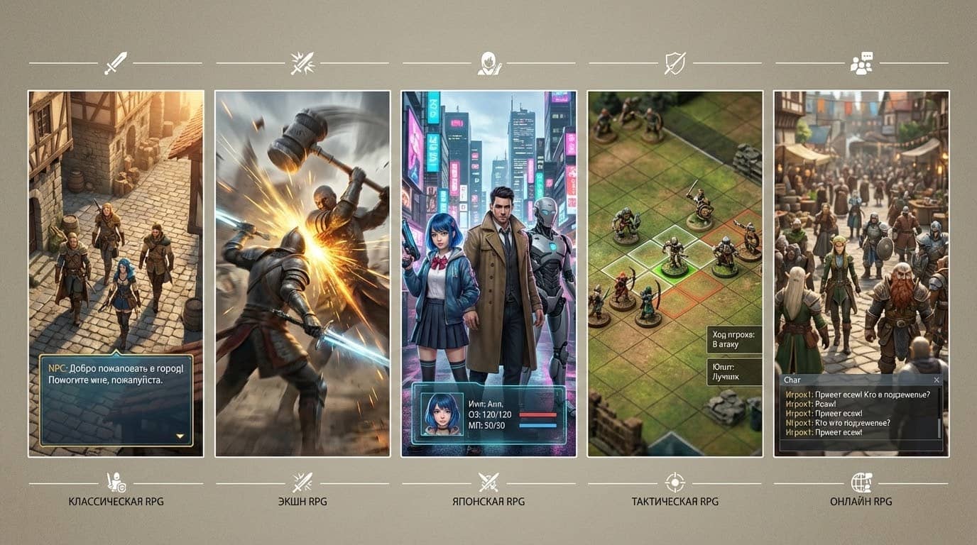 Ролевые игры делятся на несколько поджанров по тому, как подают сюжет, строят бой и взаимодействие игроков. Одни делают упор на текст и тактику, другие — на динамичный экшен или онлайн-взаимодействие.