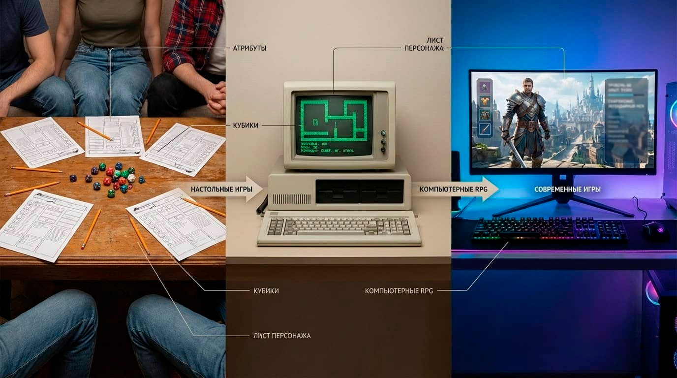 Жанр RPG вырос из настольных ролевых игр, где игроки описывали действия героев словами, а ведущий отвечал за мир и правила. Компьютеры взяли на себя роль такого ведущего: стали считать шансы попадания, урон, проверять навыки и хранить состояние мира.