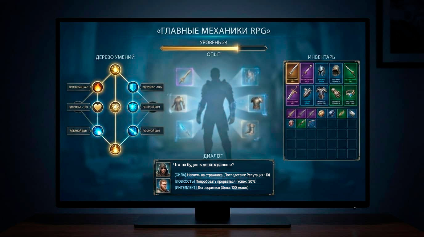 Прокачка в RPG строится вокруг опыта (XP) и уровней. За квесты и бои герой получает XP, повышает уровень и распределяет очки по характеристикам вроде силы, ловкости, интеллекта или выносливости. Через дерево умений открываются активные навыки и пассивные бонусы, формирующие стиль игры.
