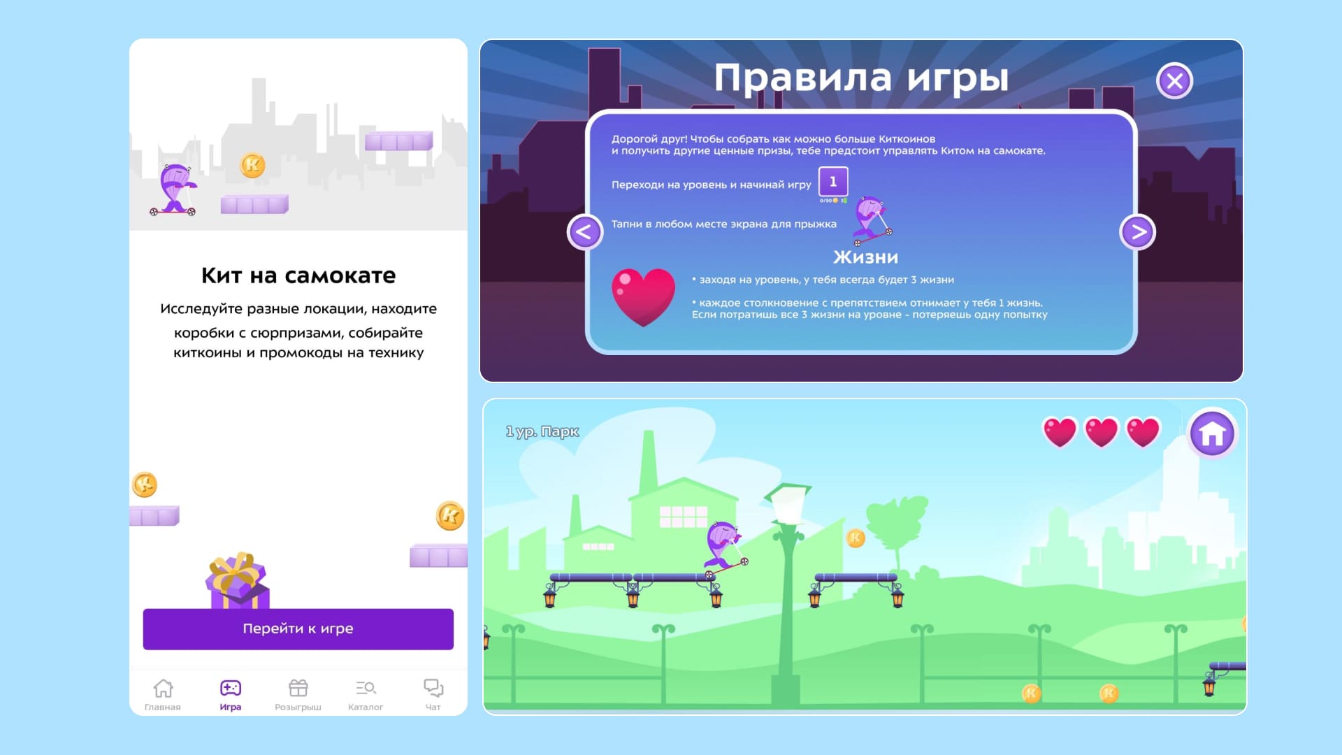 Онлайн-игры в вебе или приложениях. Самый популярный пример — игры в приложениях магазинов. Например, наш недавний кейс — промо-раннер Кит на самокате для приложения компании Kitfort. Пользователь проходит уровни в игре и собирает промокоды. Их можно использовать, чтобы купить бытовую технику бренда.