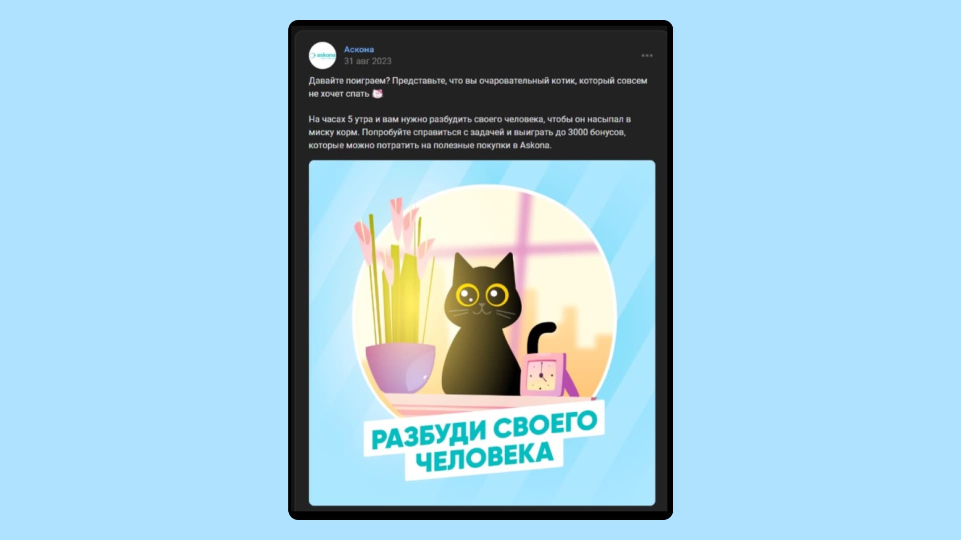 Пример — кейс бренда «Аскона». В игре «Разбуди своего человека» игроку предлагали стать котом, чтобы разбудить хозяина. За выполнение заданий — уронить игрушки, пошуршать пакетом — можно было получить баллы в программу лояльности. Так компания решила две задачи: собрала контакты новых клиентов и сразу завела их в программу лояльности, предоставила скидку на покупку товаров.