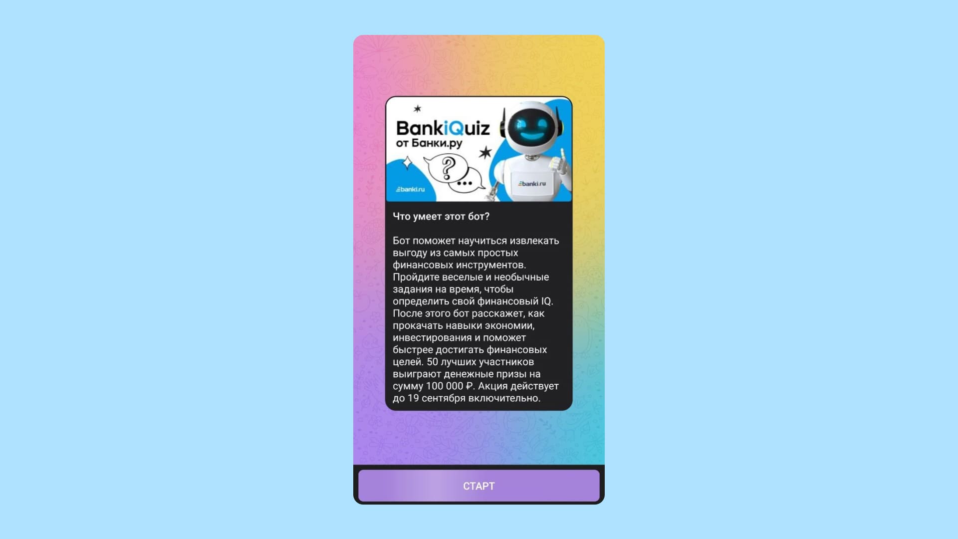 Пример — чат-бот от финансового маркетплейса Банки.ру. Игрокам предложили проверить свой финансовый IQ, а среди лучших участников разыгрывали денежные призы.