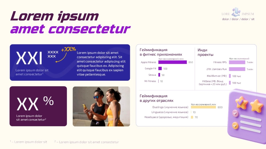 Пример: на титульный слайд мы поставили изображение спортивной девушки. Не просто потому что «красиво», а чтобы сразу показать результат — к которому ведёт игра. Это сильнее, чем абстрактные ракеты или иконки денег. После объяснения логики клиент принял идею и остался доволен.