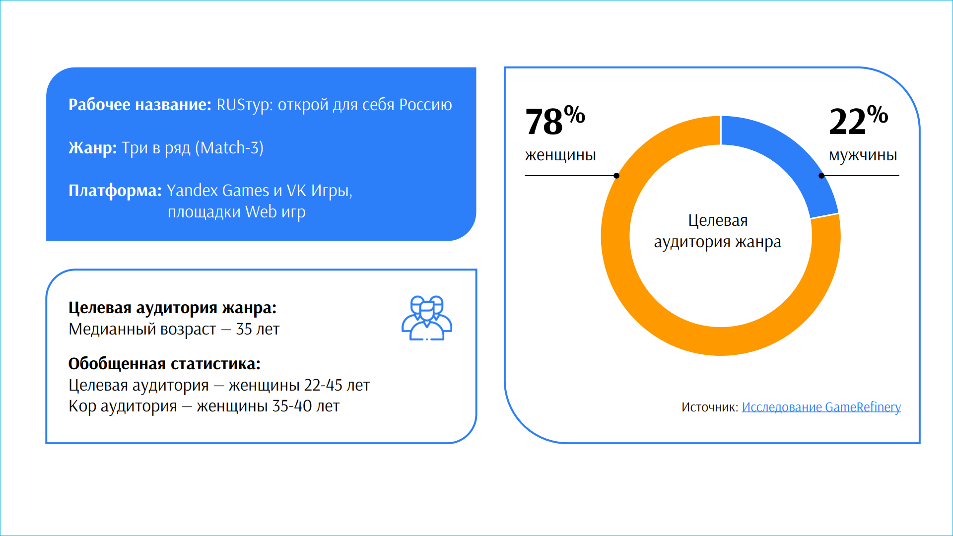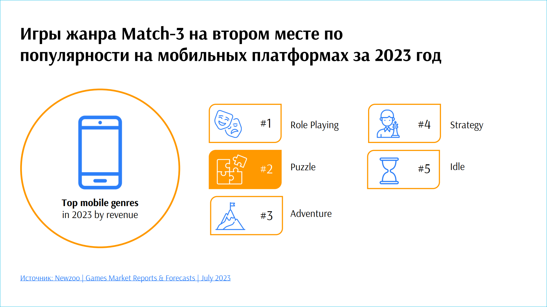 Для подтверждения актуальности игры провели анализ рынка и целевой аудитории. Были использованы исследования Newzoo и GameRefinery, показавшие популярность жанра Match-3, особенно среди женщин 35–40 лет. В ходе анализа подтвердилось, что данная категория игр популярна среди мобильных пользователей и казуальных игроков, предпочитающих простые, но увлекательные головоломки.