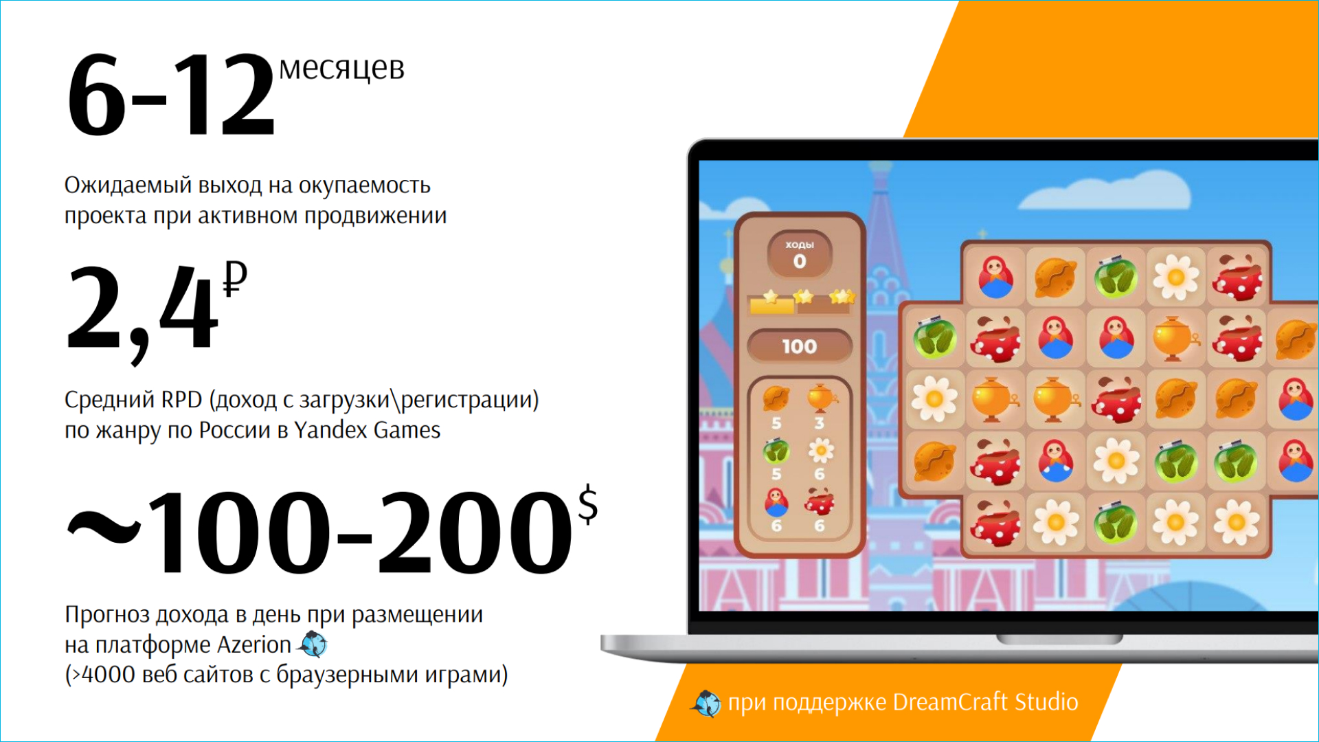 Проведенный расчет включал прогноз стоимости разработки базовой версии игры, перспективы ее расширения и окупаемости при активном продвижении. Ожидания были установлены на 6–12 месяцев до выхода на прибыль. Средний доход на одного пользователя был спрогнозирован с учетом данных о доходах игр этого жанра на рынке.
