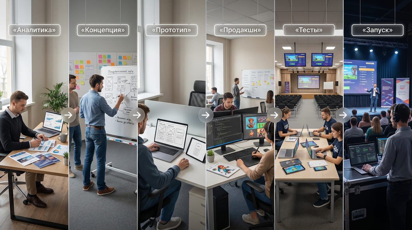Разработка для ивента идёт по чётким этапам: от идеи до поддержки на площадке. На каждом шаге важна синхронизация заказчика и команды, иначе срывается тайминг программы и растёт бюджет.
