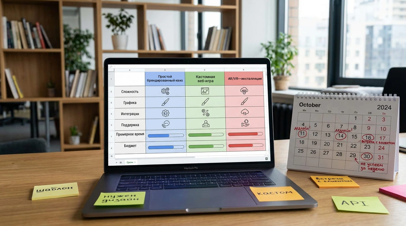 Дальше нужен чёткий бриф: аудитория, формат и площадка, технические ограничения, бренд‑гайд, тайминг, призы, требования к данным и интеграциям. На его основе подрядчик считает сроки и бюджет без сюрпризов.